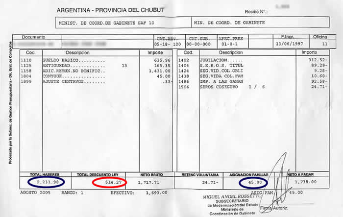 Según este recibo, salario= 2231,98 - 514,27 + 45,00 = $ 1.762,71